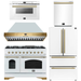 FORNO Antico Package - 48" Gas Range, Range Hood, 36" Refrigerator with Ice Maker, Dishwasher and 24" Microwave Drawer in White with Antique Brass Accents