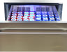 - Additional Features. The wine cooler also features two refrigerated drawers, 9 sliding metal shelves and blue LED lights.