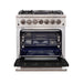 The Forno Capriasca 30 Inch Gas Range enhances your home kitchen with professional styling and performance through its durable and beautiful 304-grade stainless-steel design. The cooking surface features 5 sealed dual-ring brass burners, totaling 100,000 BTU. All burners, each at 20,000 BTU, can simmer precisely at 1,000 BTU. Continuous heavy-duty cast-iron grates facilitate easy sliding of pots or pans off heat over the enamel cooktop cavity, simplifying spill cleanup. The 4.32 cu. ft. gas oven, with a 30,000 BTU output and infrared red mesh broiler, enclosed in a blue enamel interior, offers optional convection for precise, and consistent cooking on multiple levels. For convenient viewing, a 3-layer glass oven door window is included. The package includes 3 telescopic stainless-steel oven racks, wok support, and an LP conversion kit. Additionally, zinc-coated illuminated metal knobs with bezel rings ensure enduring beauty.