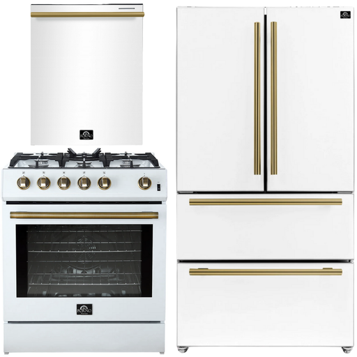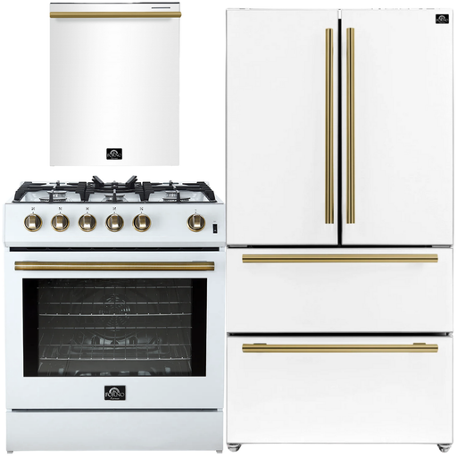 Introducing the Forno 31" 17.2 cu. ft. Refrigerator and Bottom Freezer in White with Antique Brass Handles. This stylish and spacious appliance sea...