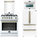 FORNO Espresso Package - 30" Gas Range, 36" Refrigerator with Ice Maker, Dishwasher and 24" Microwave Oven in White with Antique Brass Accents
