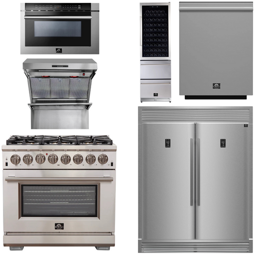 View full detailsThe Forno Appliance Package - 36 in. Pro Range with 6 Italian Burners in Stainless Steel, Range Hood, Refrigerator and Freezer, Microwave Drawer, D...