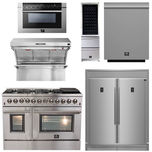 View full detailsThe Forno Appliance Package - 48 in. Gas Range with 8 Italian Burners in Stainless Steel, Refrigerator and Freezer, Microwave Drawer, Dishwasher, a...