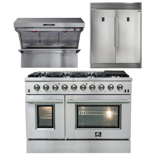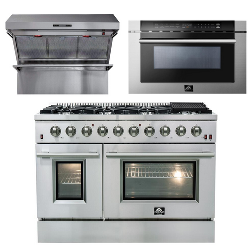 View full detailsForno Appliance Package - 48 in. Galiano Dual Fuel Range with 8 Defendi Italian Burners in Stainless Steel, Wall Mount Range Hood and Microwave Dra...
